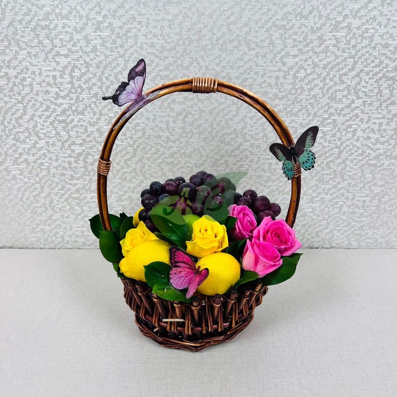 Оригинально оформленный подарок, в котором есть и сочные летние лакомства, и цветы. Только спелые и вкусные фрукты! Практичные хозяйки оценят и корзинку, однако самое главное – это цветовое и вкусовое сочетание наполнения. Словно яркий солнечный зайчик. Мило, романтично и весело! Цветы – в вазу, фрукты – на тарелку!