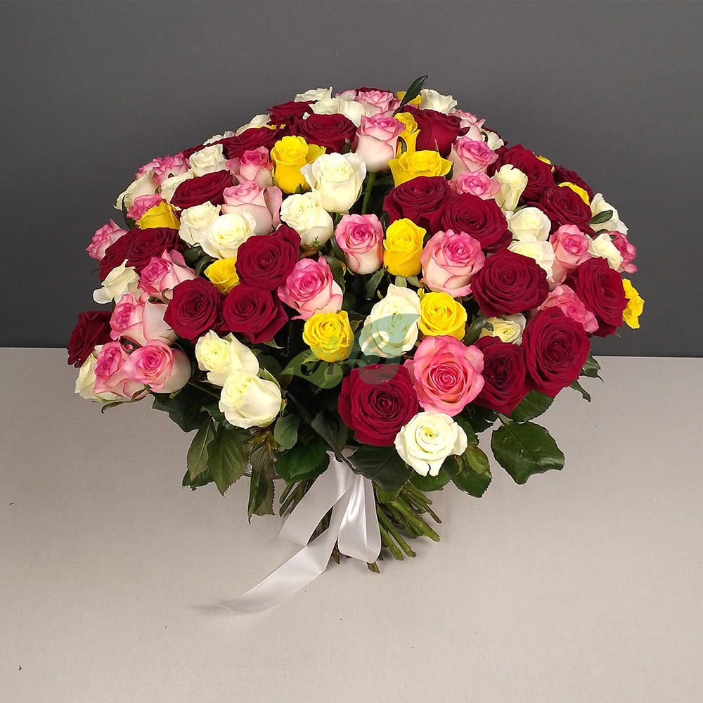 Шикарный букет из разноцветных роз будет к месту на любом юбилее или празднике. Сто одна бархатистая роза – это символ богатства, достатка и изысканного стиля. Даже в самом изысканном обществе такой красивый букет будет принят с благосклонностью и с удовольствием, да и запомниться надолго.
