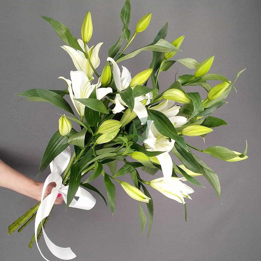 Наши флористы не используют дополнительных украшений для лилий. Ведь букет из этих величественных цветов красив и без лишней мишуры.